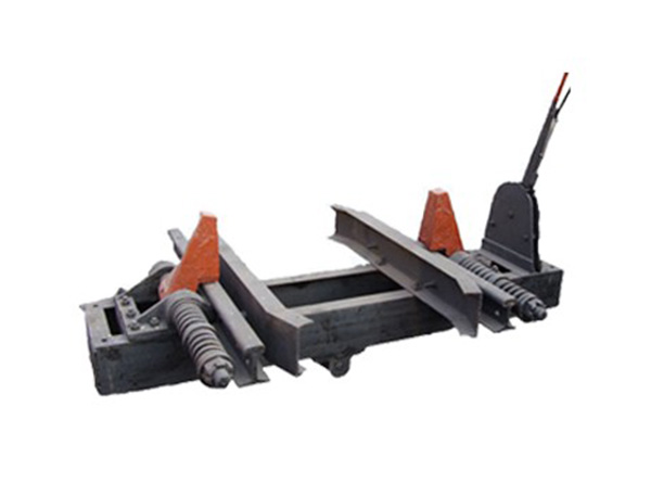 阻車(chē)器為手動(dòng)阻輪式阻車(chē)器,其有兩個(gè)阻爪和兩套彈簧緩沖裝置。當(dāng)?shù)V車(chē)車(chē)輪撞擊阻爪時(shí),撞擊能量可由彈簧緩沖裝置吸收,借以保護(hù)設(shè)備。操縱手柄,即可通過(guò)連桿裝置控制兩個(gè)阻爪同時(shí)打開(kāi)或關(guān)閉,關(guān)閉時(shí)阻車(chē),打開(kāi)后礦車(chē)即可通過(guò)。